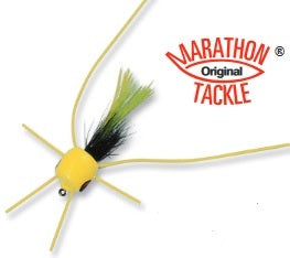 Marathon™ wiggle poppers have quality painted cork bodies which make them float high. Hackle and streamers are especially selected for just the right flare. Rubber wiggles are inserted from 3 different directions to give the spider leg effect on every cast. Hooks are secured to assure endurance. Cork body cemented on Mustad hook.